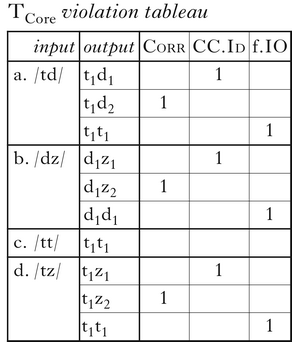 For all systems analysed here, the order of the segments is unimportant; the reverses of inputs have the same range of mappings. In TCore there are three possible outputs: faithful correspondence (cor), faithful non-correspondence (noc) and unfaithful harmony (har), for which there are co-optima, in which a feature is changed in one of the two segments. Each of these violates one of the three types of constraint.