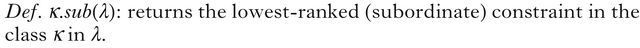 For example, if in a linear order, Corr ⪢ CC.Id, then CC.Id is the subordinate member, κ.sub. The operator has quantificational force through transitivity: if the subordinate member, CC.Id, dominates f.IO, then so too does the dominant member, Corr, by dominating CC.Id. Conversely, if the subordinate member is dominated (f.IO ⪢ CC.Id), then no ranking is established between the dominant member, Corr, and f.IO.
