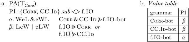 The bifurcation of TCore by P1 is shown in the value table in (9b), which lists the grammars, with their values for P1. P1.α generates two ERCs: Corr ⪢ f.IO and CC.Id ⪢ f.IO. These two ERCs are the ranking conditions which fully define the grammar f.IO-bot, and under which unfaithful mappings are possible in the languages: when both Corr and CC.Id dominate f.IO. Property P1 links the intensional characteristic of having IO faithfulness as the bottom-ranked constraint to the extensional trait of allowing unfaithful mappings – both of which distinguish f.IO-bot from the other two grammars in the typology.