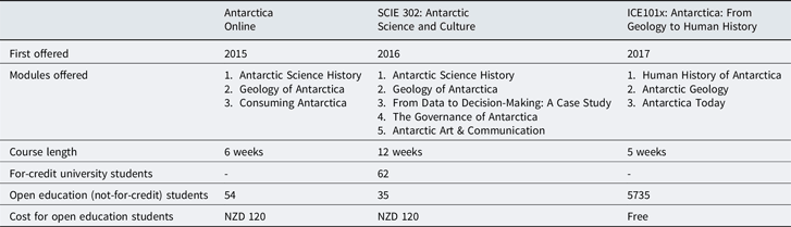 The IPY catalysed an immense surge of enthusiasm, goodwill, funding and other support for polar EOC, including stimulating lasting networks, such as the Association of Polar Early Career Scientists and Polar Educators International. During the IPY, staff at the international programme office (including Salmon) were highly aware of the political profile of the IPY, and how a positive profile generated through successful EOC could be used to leverage further research funding. As an example relevant to this paper, halfway through the IPY, the New Zealand government announced NZD 4.5 million in new funding to support IPY-endorsed research, arguably as a result of a high international profile and opportunity for major international collaborations (Salmon, Reference Salmon2007). This legacy of connecting political goodwill, positive profile through EOC, and research funding remains to this day in New Zealand (Salmon, Priestley, Fontana, & Milfont, Reference Salmon, Priestley, Fontana and Milfont2017). Understanding the national context, including New Zealand’s historical, political, geographical and logistical connections with Antarctica, is therefore critical for understanding how this MOOC came about and was so (relatively) easily facilitated.