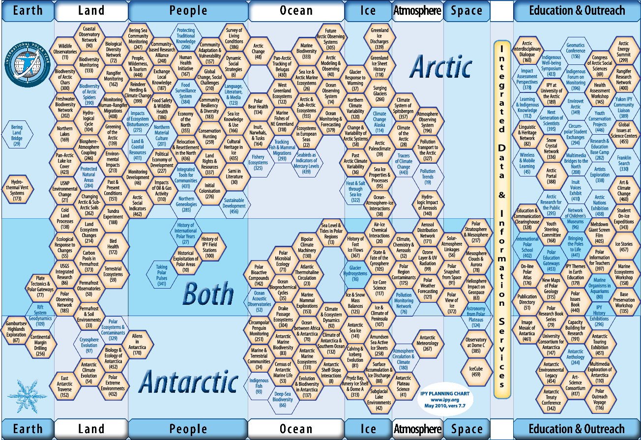 Fig. 1. Representation of projects (individual hexagons) that constituted IPY, categorized geographically (e.g. focused on the Arctic, the Antarctic or on polar regions generally) and by research topic (e.g. people, ocean, ice, etc). Each of the 170 research projects (left), the central data service and the 58 outreach projects (right) endured and passed rigorous scrutiny for international participation, data availability, probable impact, etc. In this version, hexagons with empty backgrounds represent those that failed to gain sufficient funding or that withdrew from active participation.