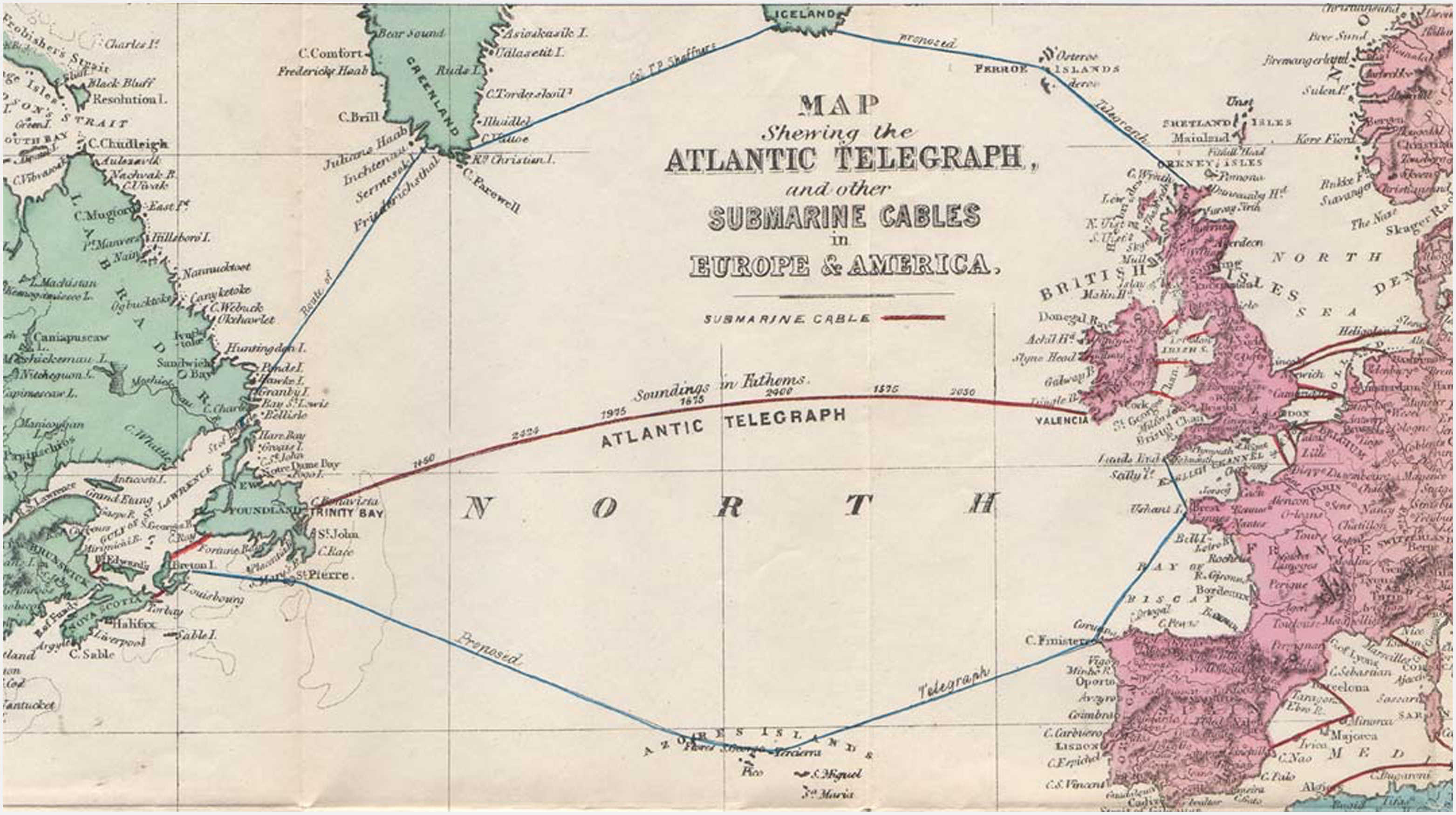 Fig. 1. Detail of map of the Transatlantic cable and Shaffner’s proposed Northern Route (The Atlantic Telegraph, 1866).