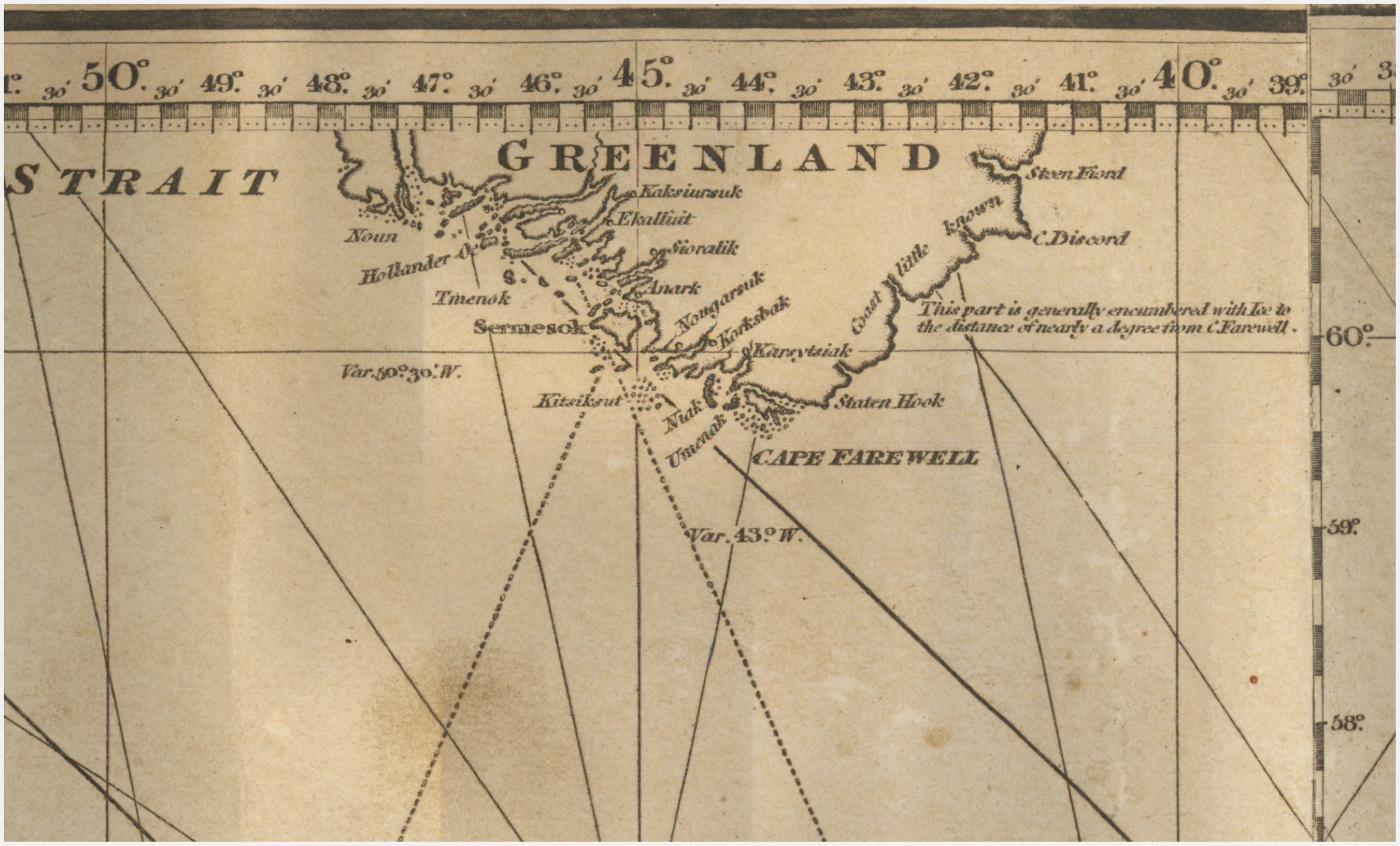 [A] Country, curbed by Ice, with an almost unreachable Coastline, where you could not sail without being caught by the Floe Ice or becoming pitifully overrun by Icebergs (…) Electrical Storms, Hurricanes, deathly cold, Snow, Icebergs, Polar Bears and other horrors of the Polar Region was what you connected Greenland with, as people mistakenly thought of the North Pole and pure forgot that Cape Farewell is on the same Latitude as Christiania [Oslo] and Skt. Petersburg.