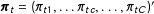 $\boldsymbol{\unicode[STIX]{x1D70B}}_{t}=(\unicode[STIX]{x1D70B}_{t1},\ldots \unicode[STIX]{x1D70B}_{tc},\ldots ,\unicode[STIX]{x1D70B}_{tC})^{\prime }$