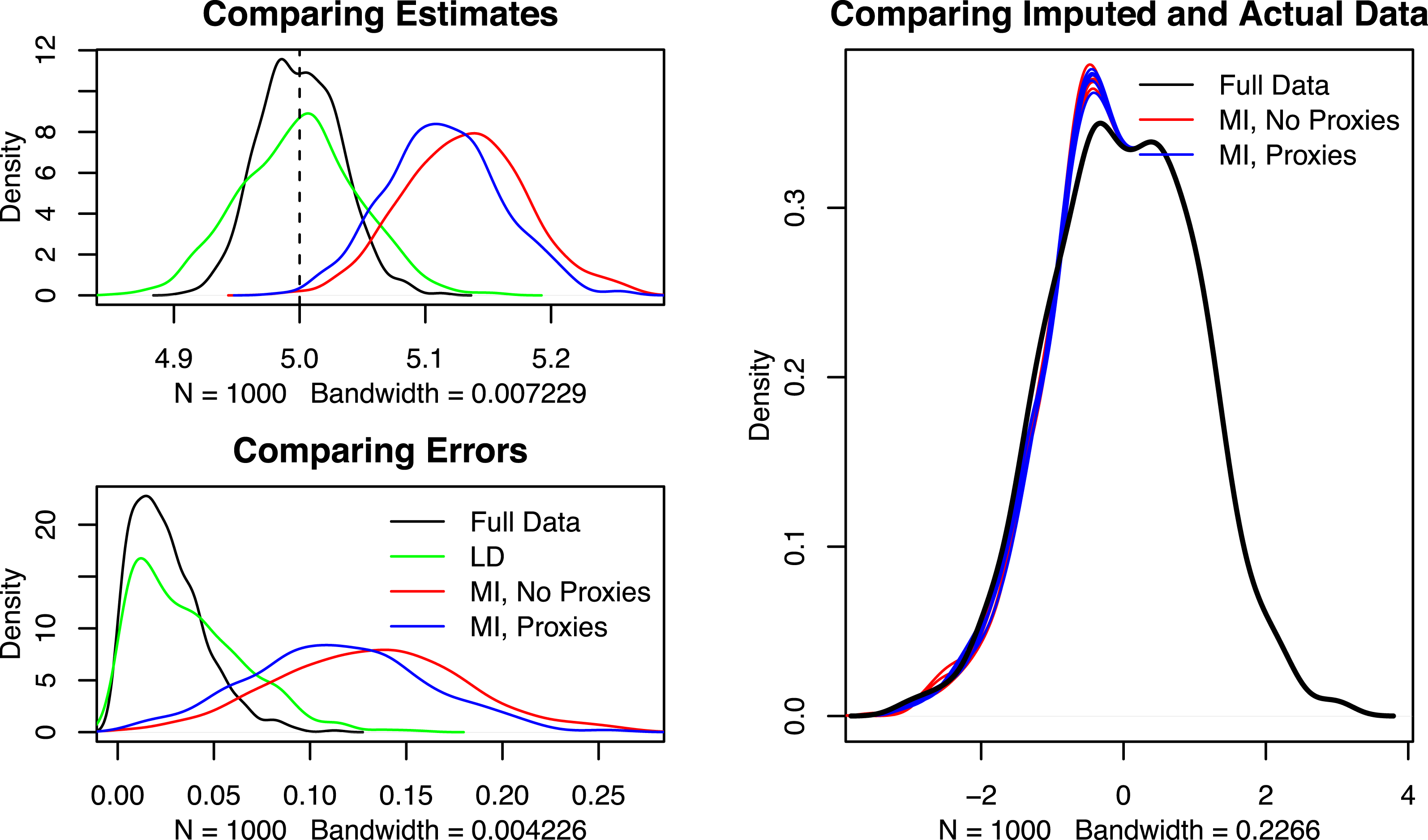 To compare results, I repeat the above procedure 1000 times. Figure 1 displays the results of these 1000 simulations (left-hand side) alongside a density plot of the true versus simulated data in one run of the multiple imputation algorithm. The top left plot shows density plots of the four estimates of