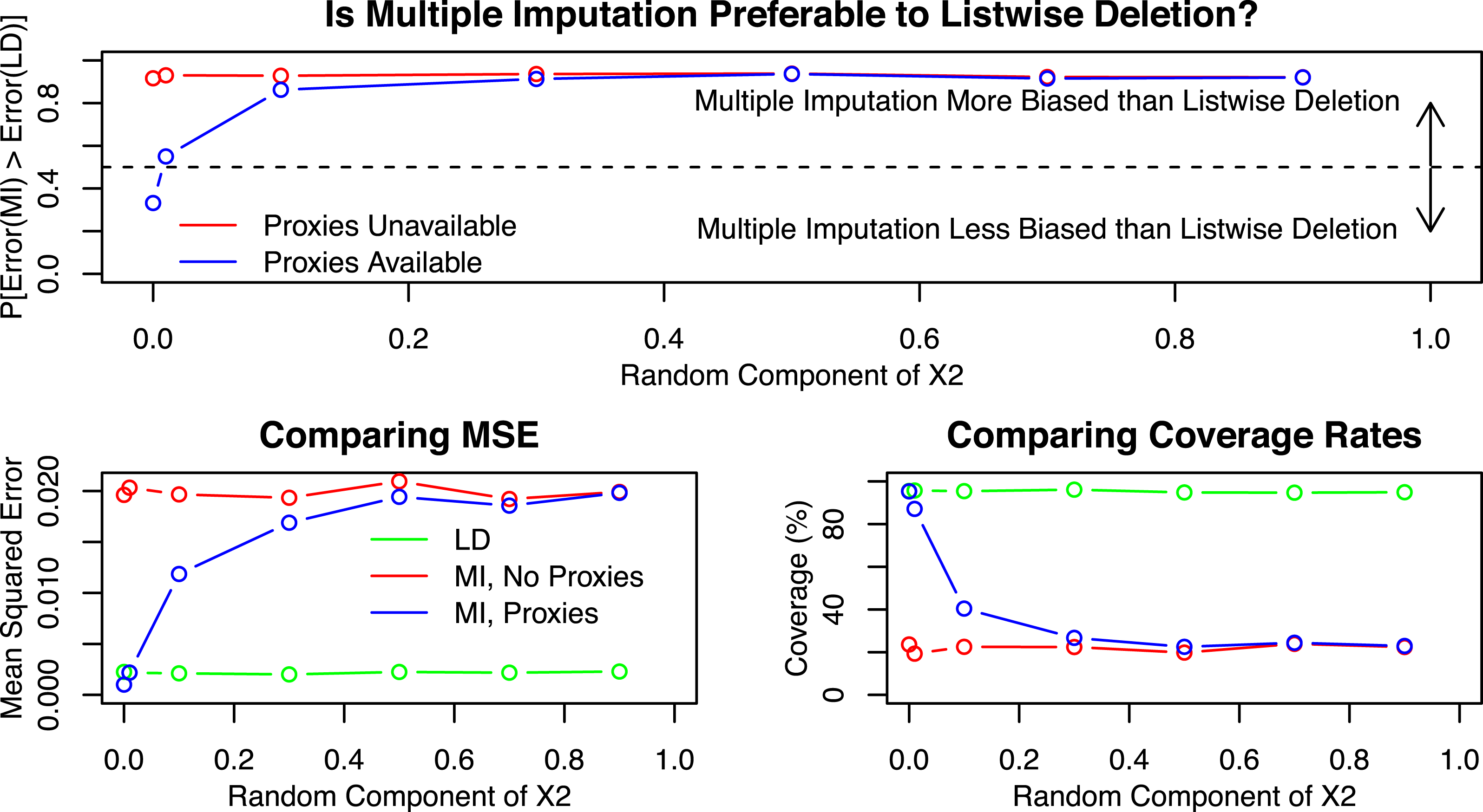 In the Supplemental Appendix I introduce gradually more complicated data structures, and examine the relative performance of multiple imputation and listwise deletion using similar metrics. These extensions introduce probabilistic missingness in