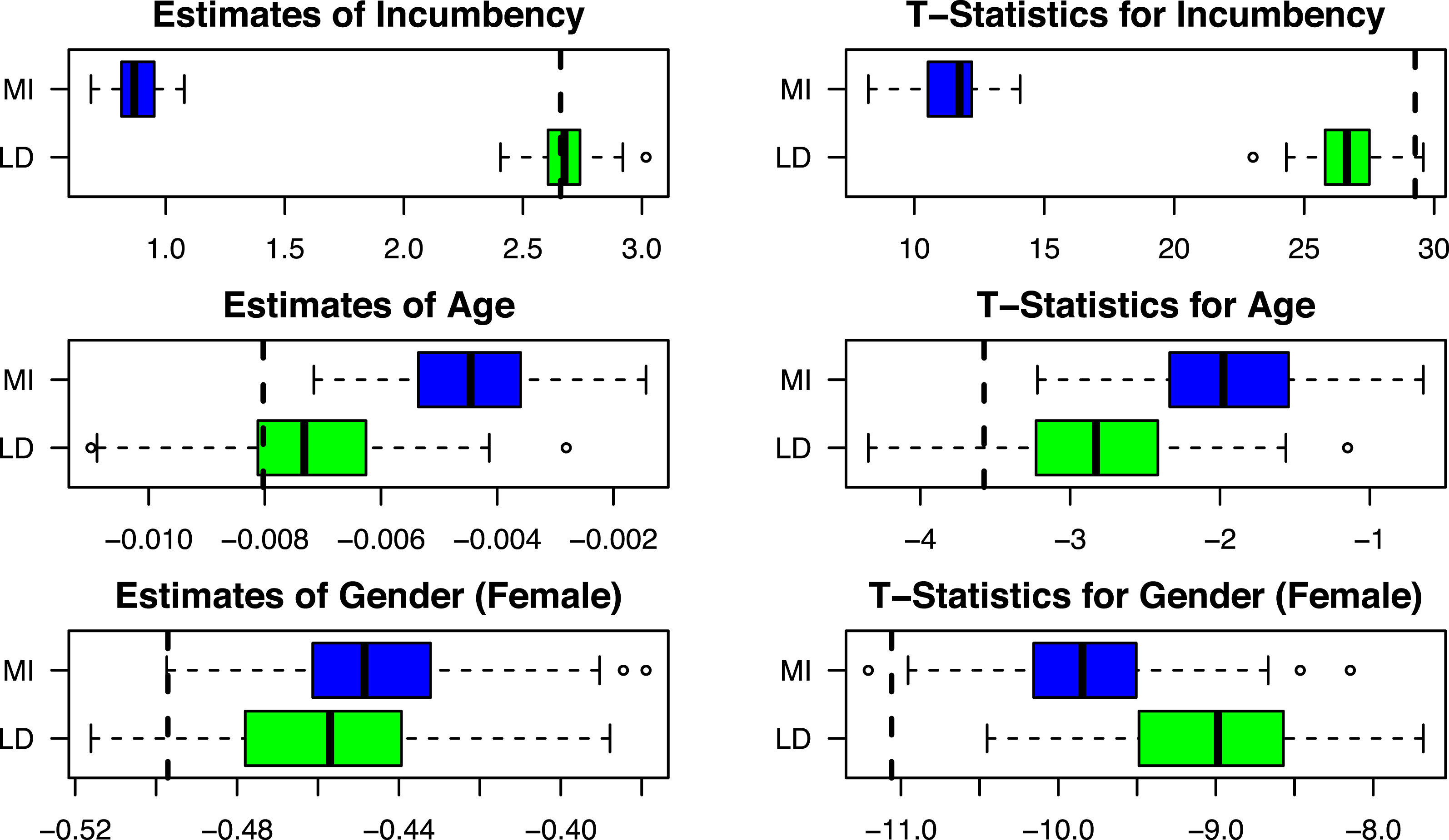 . Here, the effect of candidate age is statistically significant at the 95% level for 94% of the simulations using listwise deletion but only 51% of the simulations when using multiple imputation. In this particular case, then, multiple imputation is much more likely to result in Type-2 error than listwise deletion. Looking to