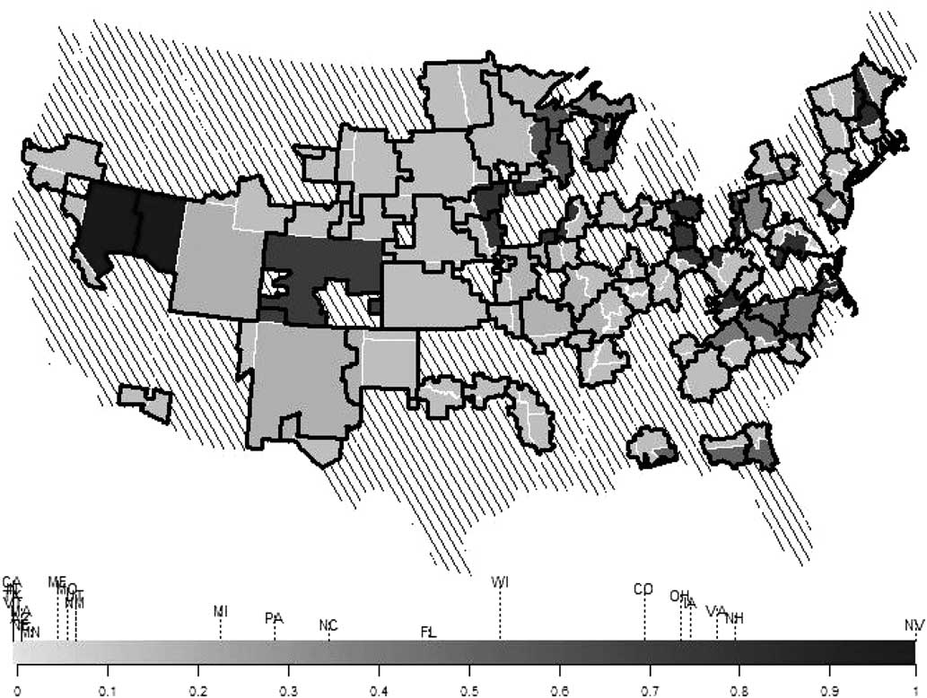 Fig. 1 RomneyEffort by state and media market Note: Media markets spanning states with different levels of RomneyEffort are surrounded by thick black lines. Portions of each media market are shaded by the level of RomneyEffort in that state. The media markets that do not span states with varying RomneyEffort (not included in our analysis) are indicated by diagonal lines. The states are also aligned horizontally along the bottom of the figure by the level of RomneyEffort (vertical alignments are varied for visual ease).