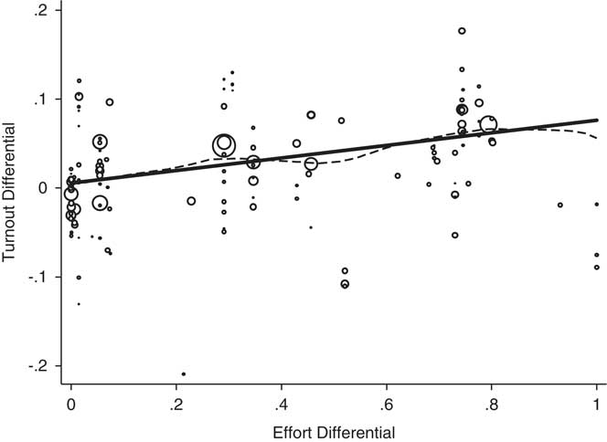 Figure 2 offers an approximate visualization of the effects of campaigning, based on the regression result in Column 7 of Table 1. Each data point represents a pair of states that share a media market. For example, the intersection of Massachusetts and New Hampshire in the Boston media market represents one data point in the figure. The difference in voter turnout between the two regions is plotted on the vertical axis, with higher values indicating higher turnout among the region that received more campaign contact. The difference in campaign effort between these two regions, as indicated by the RomneyEffort variable, is plotted on the horizontal axis. Consistent with the regression result, we see that, on average, the turnout differential increases significantly as the campaign effort differential increases. The solid line represents a linear fit, and the dashed curve represents a non-parametric kernel regression. In both cases, each observation is weighted by the population of the smaller region (represented visually by the size of the circle). This weighting approach appropriately mitigates the influence of the data points with very few observations. The slope of the line, .071, is nearly identical to the regression results in Columns 7–9 of Table 1. Moreover, the relationship between the effort differentials and the turnout differentials are approximately linear, suggesting that the marginal returns to additional campaigning do not diminish over the range of contacts made by the campaigns. If these effects did diminish, then we would see the turnout differentials level-off at a certain point. However, the effects of campaigning appear to increase linearly in proportion to its intensity, helping to explain the large cumulative effects that we detect.
