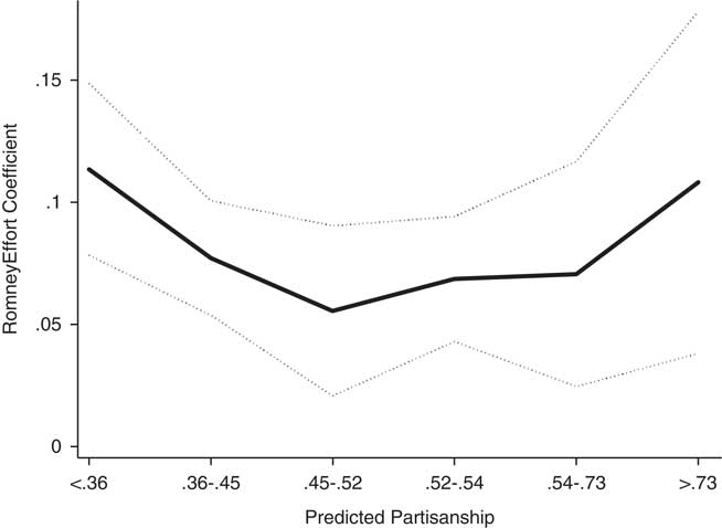 This analysis allows us to roughly compare the effectiveness of the Obama and Romney campaigns in mobilizing their respective supporters. Despite the purported technological sophistication of the Obama campaign and its intense use of data-driven, evidence-based campaign tactics (e.g., Issenberg Reference Issenberg2013), we see similar mobilization effects on both sides of Figure 3. The two campaigns were roughly comparable in their ability to turn out supporters. Moreover, this result is not an artifact of using the RomneyEffort variable; we obtain similar results with the other measures of campaign effort. Of course, this analysis does not preclude the possibility that the Obama campaign exceeded Romney in other areas that are more difficult to measure like persuasion or targeting. However, on the dimension of mobilizing people who look demographically like supporters, both campaigns appear to have been comparably effective.