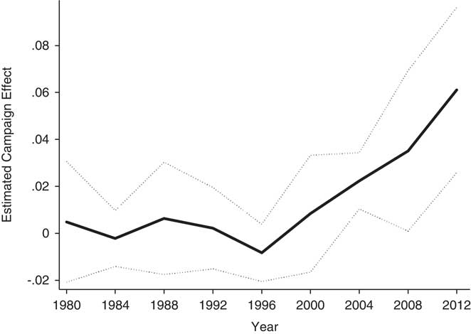 Fig. 4 Increasing campaign effects in recent presidential elections Note: The figure shows regression coefficients exploiting within-state changes in turnout as a state switches from non-battleground to battleground in a particular year. Dotted lines indicate 95 percent confidence intervals (derived from state-clustered standard errors).