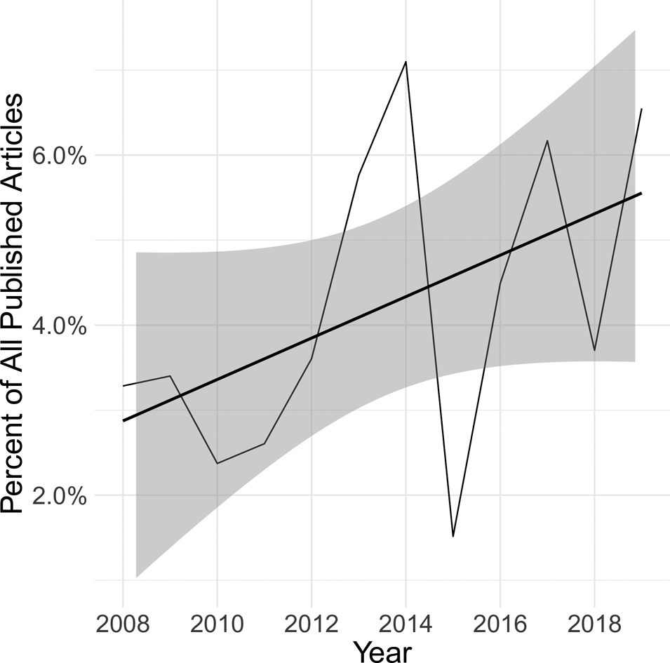 Figure 1. Percent of all articles published in top six political science journals that study political violence with human participants, 2008–2019.