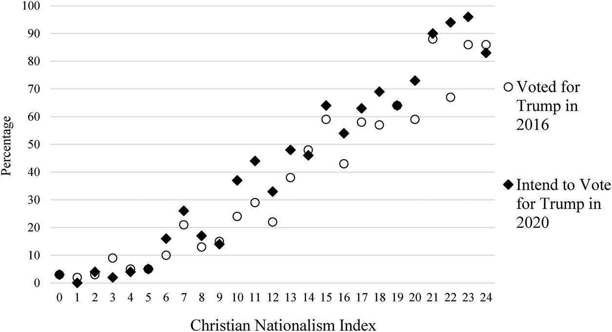 Figure 1. Percentages of Americans who voted for Trump in 2016 and those who planned on voting for Trump in November 2020 across scores on Christian nationalism index.