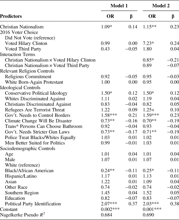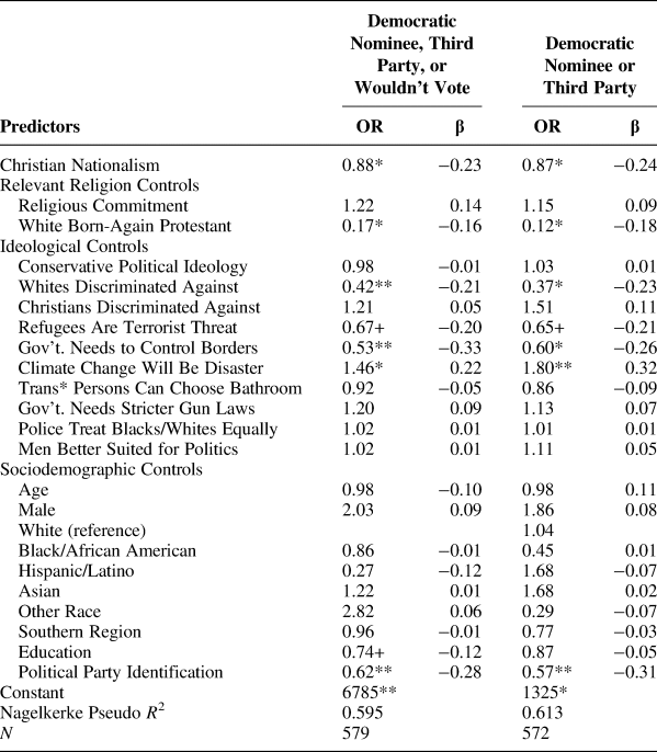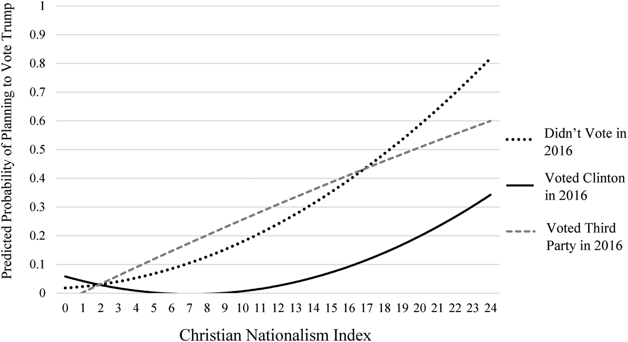 For the first analysis where we predicted intent to vote for Trump among Americans who previously did not vote for him in 2016, we include as controls Americans' vote choice in 2016. We created three categories: Did not vote, voted for Hilary Clinton, and voted for a third party candidate. The did not vote group are the reference and we create interaction terms with Christian nationalism × voted for Hilary Clinton and Christian nationalism × voted for a third party candidate.