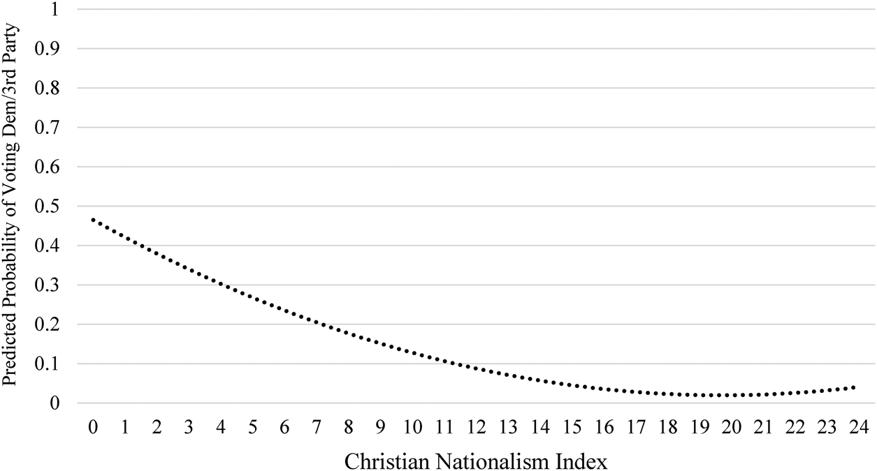 Figure 3 illustrates this relationship by plotting the predicted probability that those who voted for Trump in 2016 would intend to vote for another candidate in 2020 across values of Christian nationalism. While the likelihood of voting for a Democratic or third party candidate was essentially a coin flip for former Trump-voters who largely reject Christian nationalist ideology, this likelihood declined rapidly as adherence to Christian nationalism increased.