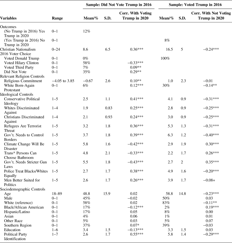 Following Trump's surprising victory in the 2016 Presidential election, numerous studies drawing on post-election surveys sought to understand which factors played crucial roles in influencing Americans to vote for Trump. Along with political party identification and ideology (which are always the strongest predictors of partisan voting behavior), social scientists identified ethnocentrism and racism (Major, Blodorn, and Blascovich Reference Major, Blodorn and Blascovich2018; Schaffner, MacWilliams, and Nteta Reference Schaffner, Macwilliams and Nteta2018; Guth Reference Guth2019; Reny, Loren, Valenzuela Reference Reny, Loren and Valenzuela2019), fear of terrorism driven or amplified by Islamophobia (Whitehead, Perry, and Baker Reference Whitehead, Perry and Baker2018; Guth Reference Guth2019; Tucker et al. Reference Tucker, Torres, Sinclair and Smith2019), hostile sexism (Schaffner et al. Reference Schaffner, Macwilliams and Nteta2018; Bracic, Israel-Trummel, and Shortle Reference Bracic, Israel-Trummel and Shortle2019), economic anxiety or dissatisfaction (Morgan and Lee Reference Morgan and Lee2018; Sides et al. Reference Sides, Tesler and Vavreck2018), and religious or Christian nationalism (Gorski Reference Gorski2017; Whitehead et al. Reference Whitehead, Perry and Baker2018; Whitehead and Perry Reference Whitehead and Perry2020) as powerful predictors. Within the past year, an emerging body of research sought to predict who intended to vote for Trump in 2020, and analyses yielded similar results. Specifically, researchers showed that Christian nationalism along with xenophobia, Islamophobia, and other factors remained powerful indicators that Americans planned on casting their ballot for Trump in November 2020 (Baker, Perry, and Whitehead Reference Baker, Perry and Whitehead2020).