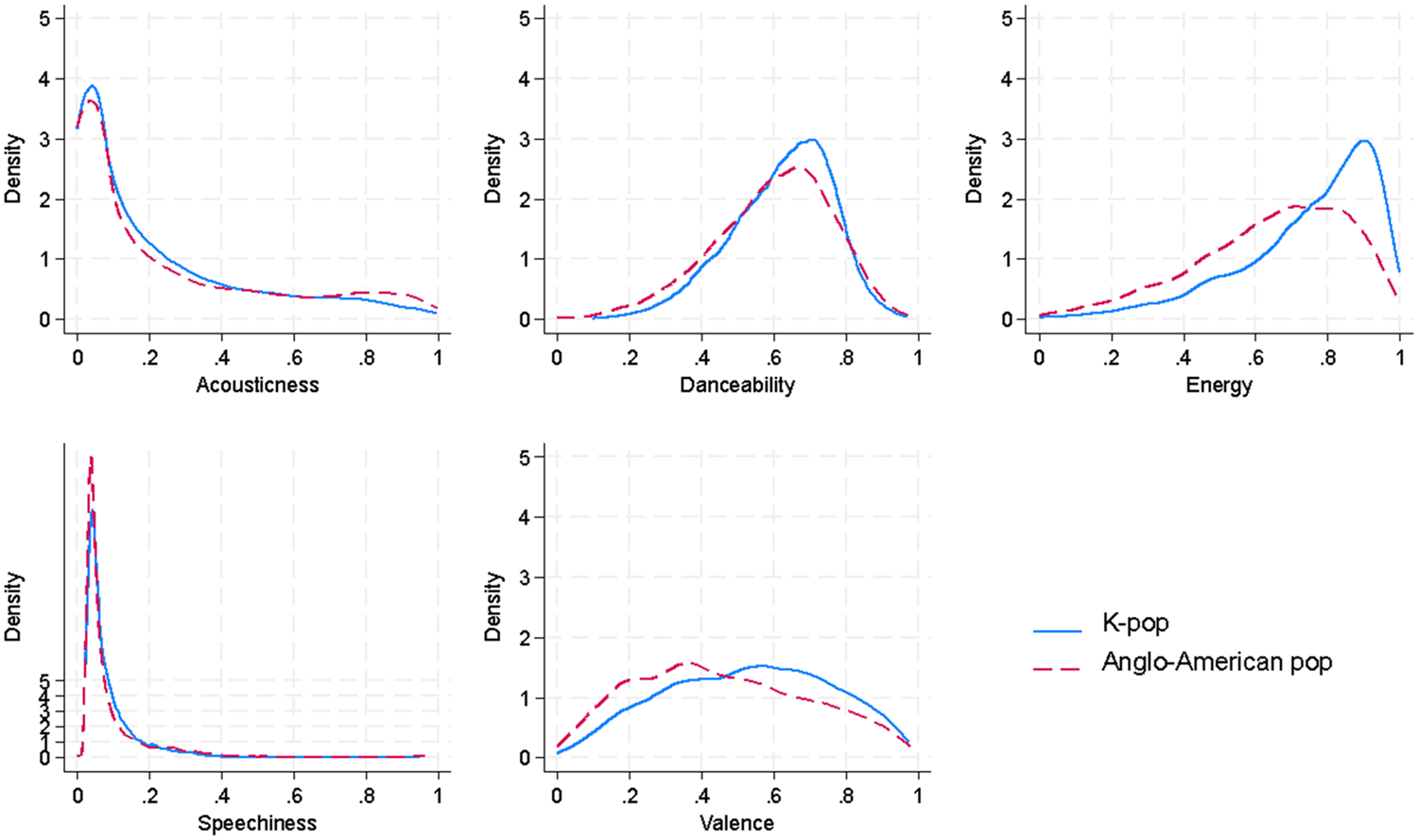 Figure 1. Audio features: K-pop vs. Anglo-American pop (kernel density plots).