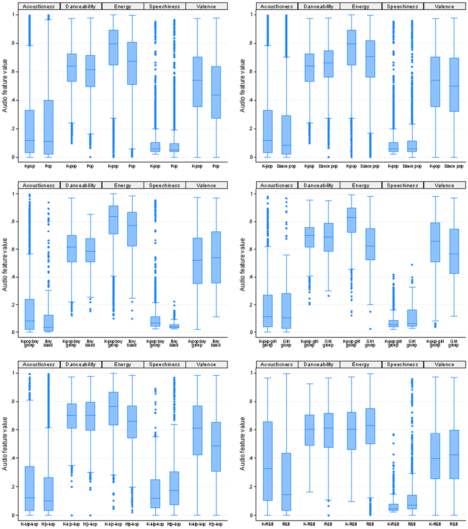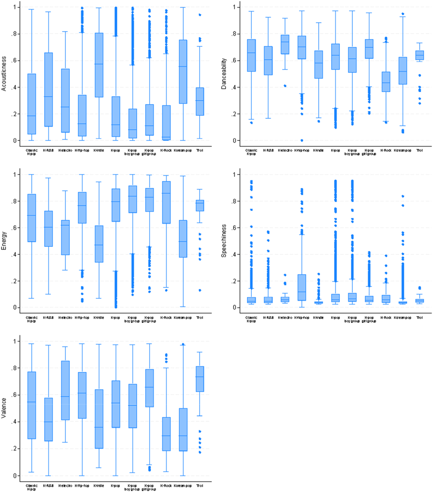 To further investigate the specificity of K-pop, Figure 2 provides a comparison of the audio features of the different genres used by Spotify to classify Korean artists. Figure 2 still shows the distribution of songs across the different audio features, but this time using box plots that depict values based on their quartiles. They include the maximum value, minimum value, sample median and the first and third quartiles. The ‘whiskers’ (lines extending from the boxes) indicate the variability outside of the upper and lower quartiles.