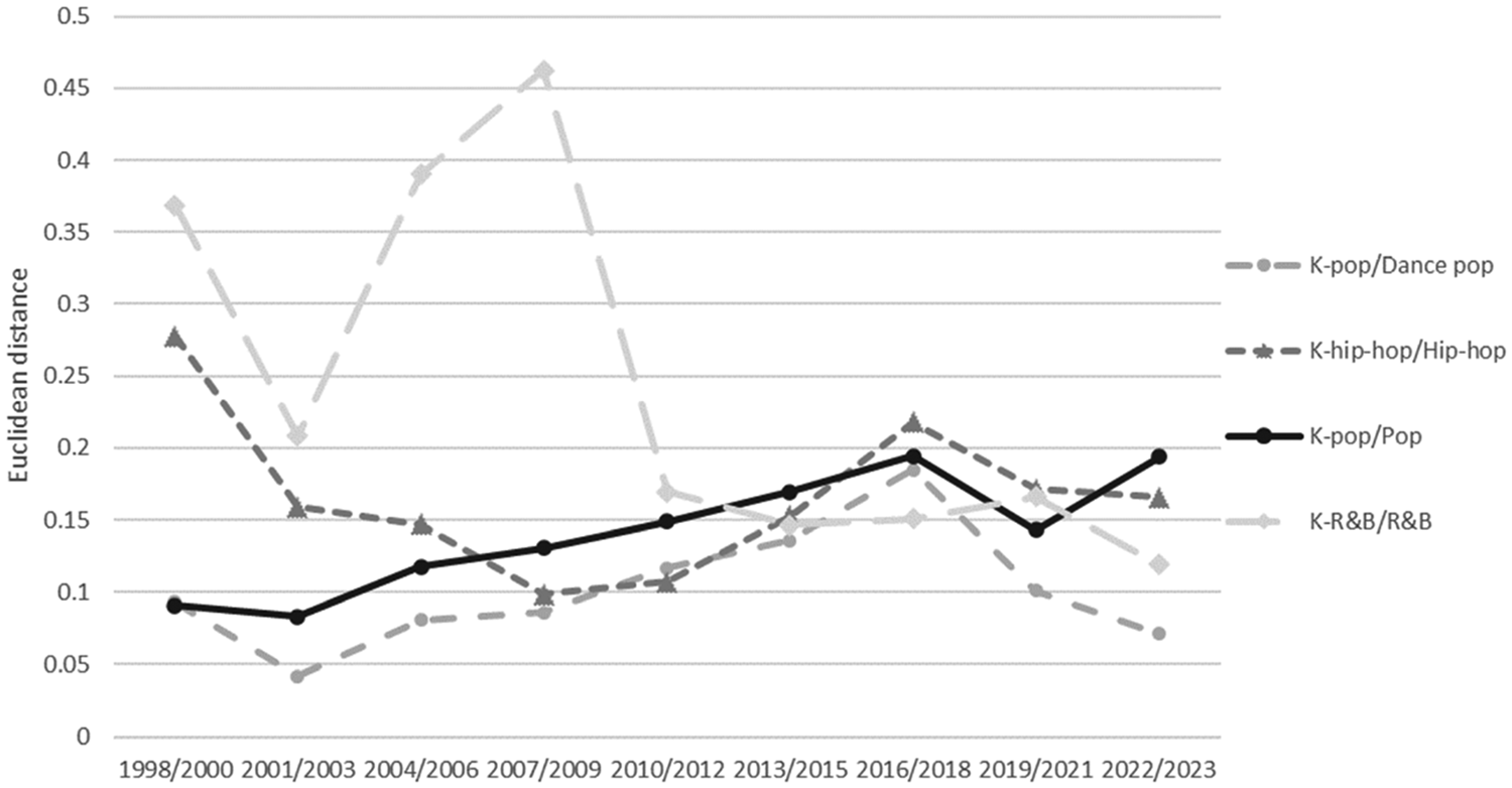 Referring to the different K-pop ‘waves’ described by Jung (Reference Jung, Lee and Nornes2015), the early 2000s was the period where some solo singers, such as Rain, tried to enter the US market (second wave) without being too successful (Shin Reference Shin2009). They were followed by new boys and girls idol groups (such as TVXQ or Wonder Girls) that created the musical and visual style associated with K-pop today and managed to reach an audience beyond Korea (third wave). However, it is only with the fourth wave and idol groups such as Girls’ Generation that K-pop became popular in the US in the 2010s. This phase seems to be associated with more dissimilarity for all the genres compared on Figure 4, pointing out again that it was not about creating music more similar to Anglo-American pop.