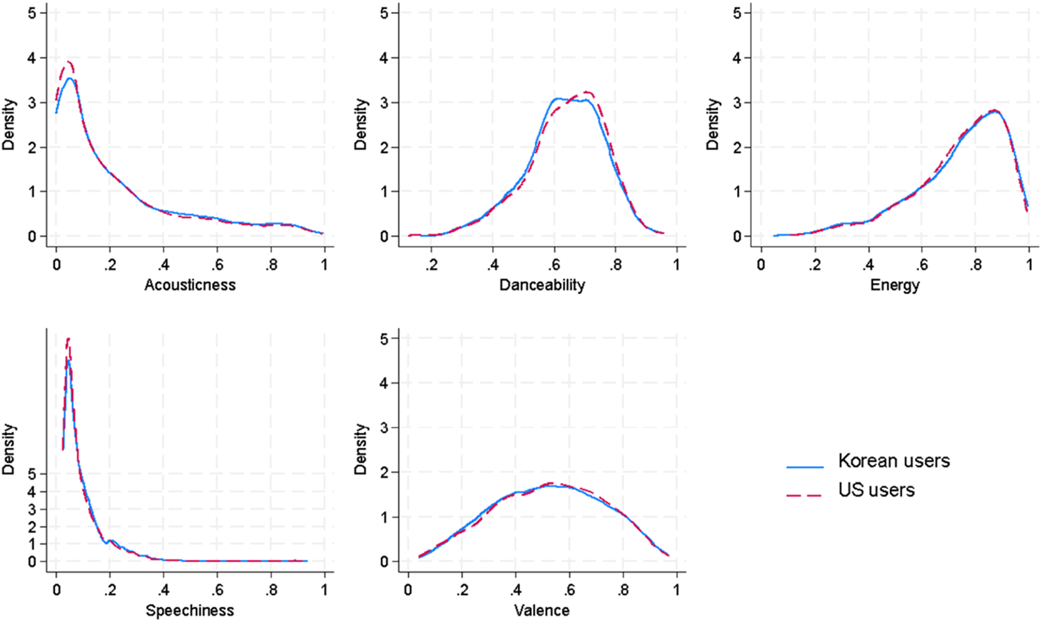 Figure 5. Audio features of K-pop: US Spotify users vs. Korean Spotify users.