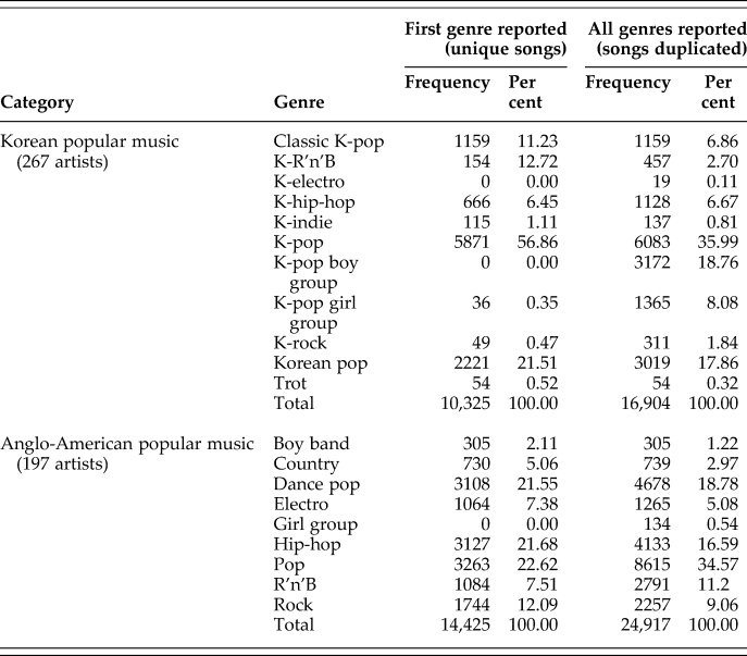 Despite this limitation, the results align with the cultural hybridity of K-pop, which aims to appeal to a global audience. This is consistent with the strategies of Korean entertainment companies targeting success in both the US and Asian markets (Shin Reference Shin2009). It also highlights that it is not through some of its specific sub-genres that K-pop has become popular in the US (where for example hip-hop and R'n’B are more popular, as seen in Table 1).