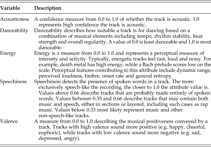 The primary data used in the analysis are audio features, which include factual information like track duration, key, mode and tempo, as well as variables aimed at characterising the music, such as acousticness, danceability, energy, speechiness and valence. These are the main variables used in the paper (Table 2). They are the result of algorithms applied to sound data. Variables such as valence may seem subjective as they assume that the music itself conveys some positive or negative feelings, independently of how it is received by the listener. While these variables are based on objective sound characteristics, they can still reflect the subjectivity of the engineers who designed the algorithms.