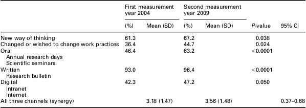 The study had a longitudinal design that covered a long period. It can therefore be assumed that the effect obtained between the two measurement occasions has a higher level of confidence compared with cross-sectional studies (Holford, Reference Holford2002). The fact that Cronbach's α (0.85) was satisfactory for validation of the questions on communication increases the reliability of the instrument (Morténius et al., Reference Morténius, Marklund, Palm, Fridlund and Baigi2011b). In addition, the multivariate analyses performed with regard to possible confounders increased the confidence. Moreover, it was not possible to find relevant controls for the participants, as approaches among R&D units in Sweden vary (Tydén, Reference Tydén2009). The theory-driven methodological implementation process, together with a validated evaluation instrument, should be considered a reliable tool in the implementation of EBT (Estabrooks et al., Reference Estabrooks, Squires, Cummings, Birdsell and Norton2009).