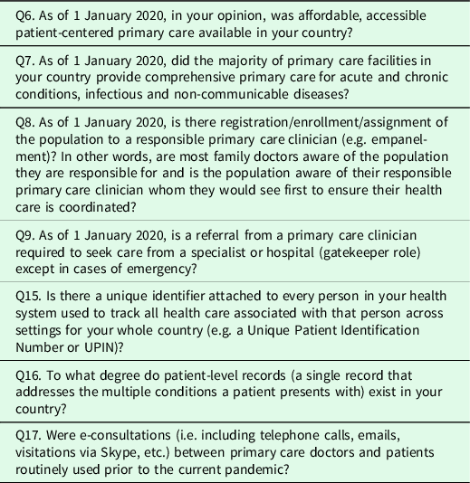 In an effort to better understand global PHC response to the pandemic, we conducted a survey from 15 April 2020 to 4 May 2020 using a convenience sample pulled from the World Organization of Family Doctors member network, WHO, and other global PHC organization contact lists. Respondents were encouraged to share the survey, so it is not clear how many total recipients received it. The 34-item survey assessed attributes of a strong PC system (see Table 2), national preparedness, and national response strategies to counter the COVID-19 pandemic. Further elaboration on survey methods, validation, and qualitative and quantitative analyses are presented in previously published papers (Goodyear-Smith, et al., Reference Goodyear-Smith, Kinder, Mannie, Strydom, Bazemore and Phillips2020, Reference Goodyear-Smith, Kinder, Eden, Strydom, Bazemore, Phillips, Taylor, George and Mannie2021).