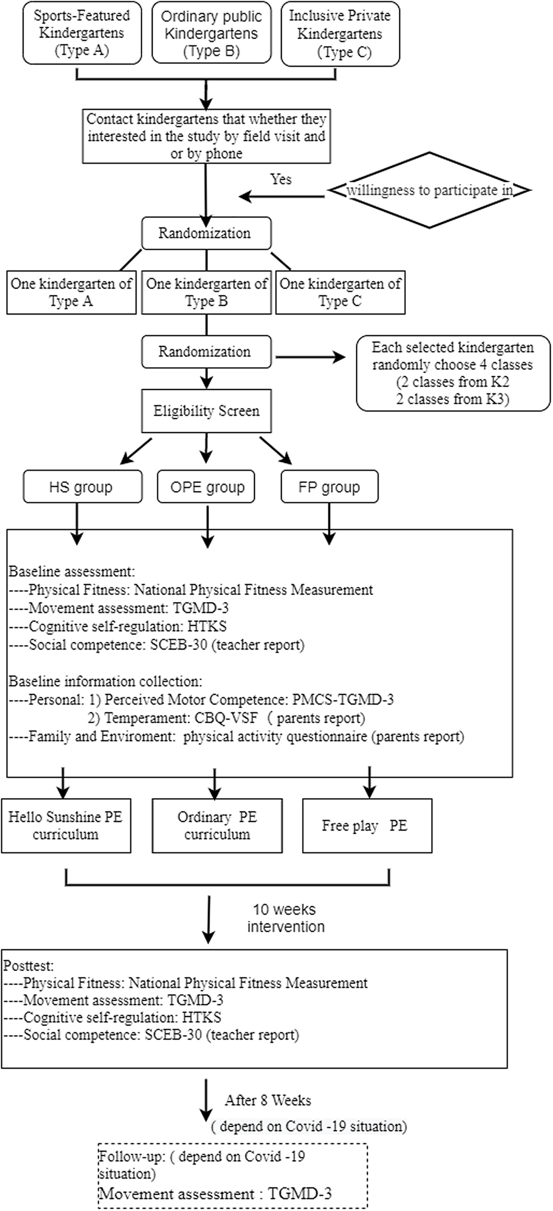 Figure 2. Study procedure. HS: Hello Sunshine PE curriculum; OPE: Ordinary PE curriculum; FP: Free play PE