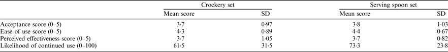 Values are mean scores for combined 5-point Likert sub-scores for: Liking, fitting in kitchen, fitting with home life and not feeling embarrassed of using it (Acceptance); Ease to use, resistant to wear and tear and having clear instructions (Ease of use); Helping to learn portions, measuring new foods, used continuously and helping with dietary goals (Perceived effectiveness); and 100 mm VAS scores (Likelihood of continued use).