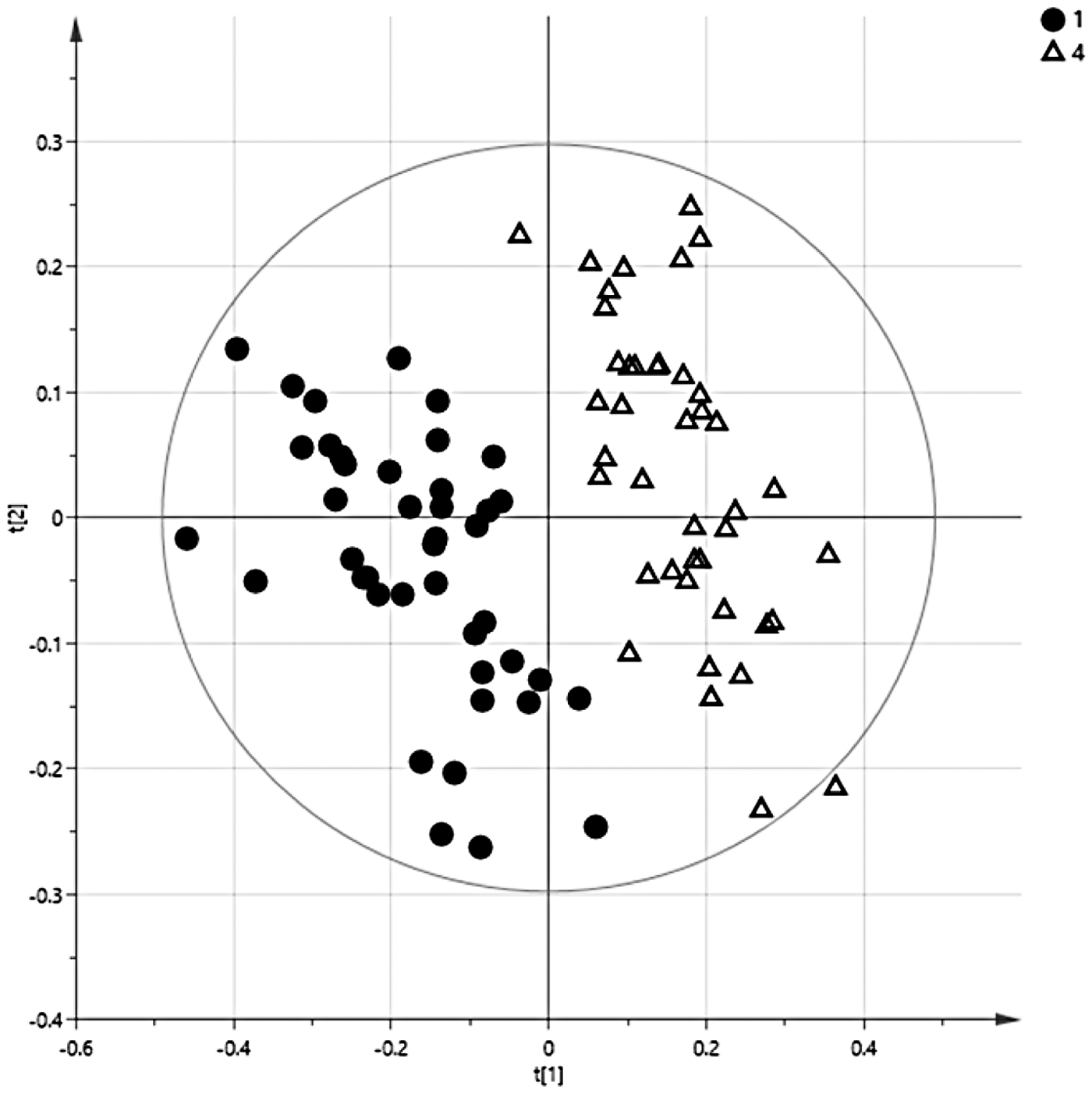 Fig. 1. PLSDA scores plot of urine metabolomics profiles collected at month 1 and month 4.