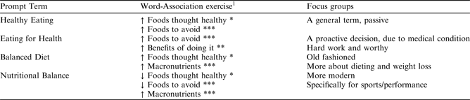 Governments worldwide make substantial efforts to reduce the contribution of poor diets to NCDs. Scotland has higher rates of NCDs than most other European countries and it has proved difficult to improve this situation(Reference Wrieden, Armstrong and Sherriff1). While health promotion messages have some impact on consumer awareness of ‘eating for health’, this does not necessarily translate into changes in consumer behaviour(Reference Wells, Wyness and Coe2). Common terminology used to communicate the concept of ‘eating for health’ such as ‘healthy eating’ is often confused with dieting for weight loss(Reference Paquette3). Additionally, food marketing has found value in using ‘healthy eating’ terminology, which may dilute or confuse genuine health promotion messages(Reference Schofield and Mullainathan4). The present study aimed to define public perceptions around ‘eating for health’ terminology.