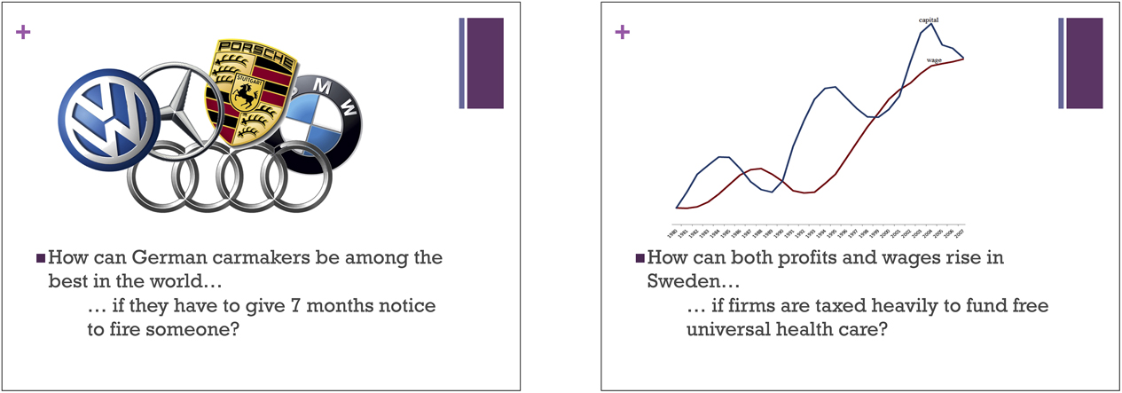 The second version of the third slide focused on long-term political topics, such as structural issues that might differ across countries. Specifically, I presented information on how the configuration of democracy and capitalism differ across Germany, Sweden, and the United States (figure 4). For several reasons, I chose the examples involving the perception of unions, maternity leave, and corporate finance. First, these issues are slowly changing, reflecting a long-term perspective in sharp contrast to a focus on fleeting current events. Second, these issues are general enough to be easily comprehensible to non-political science students. Third, students cannot expect an immediate payoff with respect to their employability because these issues do not have a direct application to specific careers. In other words, this frame is likely to attract those interested in learning for the sake of learning.Footnote 3