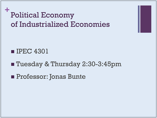 Each treatment consisted of four PowerPoint slides and a three-minute monologue at the beginning of class. Of these four slides, the first two and the fourth were identical across treatments. The two opening slides, shown in figure 1, were designed to grab students’ attention. For this reason, slides 1 and 2 provide concrete examples contrasting how things “work” in Germany and in Sweden versus the United States. Similarly, the fourth slide was identical across treatments; as shown in figure 2, it merely states the name of the course, course number, day and time, and instructor’s name. In short, both the front and the back ends of the information provided to students were identical across all sections. The third slide, however, differed across treatments. I developed three versions of this slide.
