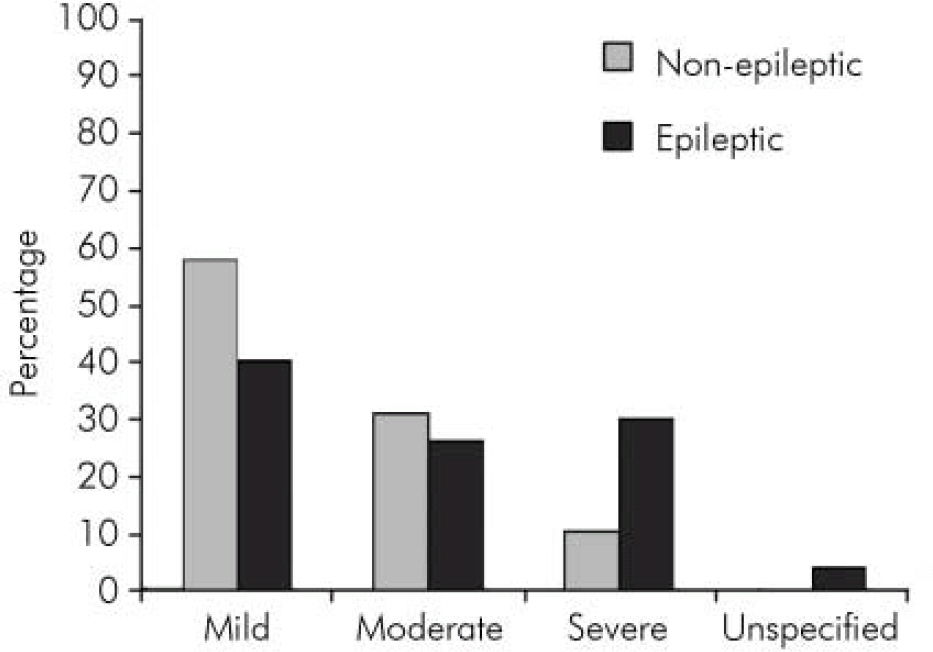 Figure 1 shows the distribution pattern of the level of learning disability between the two groups. There were more non-epileptic service users with mild learning disability (58% non-epileptic v. 40% epileptic) and almost equal number with moderate learning disability (31% and 26%) in the two groups. Users with epilepsy were nearly three times more likely to have severe learning disability than those without epilepsy (respectively 11% and 30%).