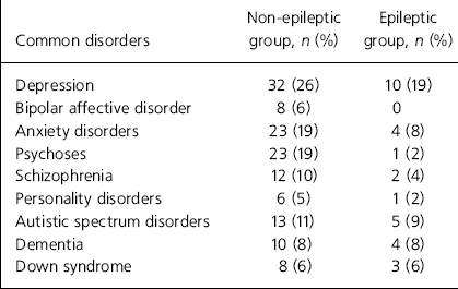 As regards psychiatric conditions, depression was by far the most common diagnosis in both groups (Table 2), being slightly more common among people without epilepsy. Other conditions such as anxiety disorders, psychoses, schizophrenia and autistic-spectrum disorders were also prevalent among this group. There was no significant difference between the prevalence of conditions with an organic element such as dementia and Down syndrome between the two groups.