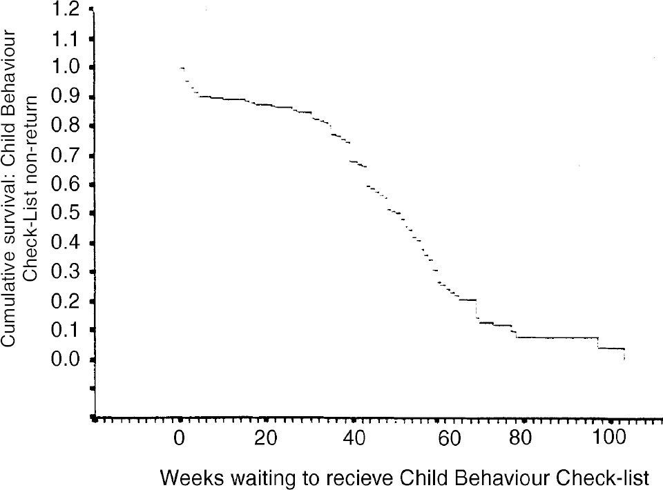 Waiting lists are an important indicator of mismatch between supply and demand in the NHS. Therefore, successive governments have made their reduction a priority, with monies earmarked specifically for their reduction, in waiting-list initiatives. However, their efficiency depends on the likelihood of attendance once an appointment is sent. In child and adolescent psychiatry generally, non-attendance rates are typically between 14 and 35%, though higher rates have been reported (Reference Cottrell, Hill and WalkCottrell et al, 1988; Reference Kourany, Garber and TornuscioloKourany et al, 1990; Reference Mathai and MarkantonakisMathai & Markantonakis, 1990). A long delay between referral and contact with the service is an important reason for non-attendance (Reference Gerber, Leixnering and ReineltGerber et al, 1990; Reference Kourany, Garber and TornuscioloKourany et al, 1990; Reference Munjal, Latimer and McCuneMunjal et al, 1994) but the relationship between waiting time and attendance likelihood has not been quantified, so estimating the extent of non-attendance from the composition of the list is difficult. We therefore report a survival analysis of a waiting-list initiative. This quantitative assessment might improve predictions of the resources needed to address treatment queues.