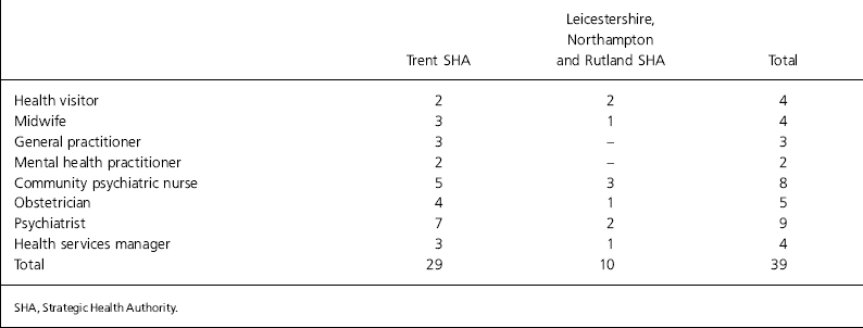 Our area of interest was the East Midlands. This involved the participation of two strategic health authorities, six health communities, four mental health trusts, twelve maternity hospitals and twenty-four primary care trusts. Two groups of informants were recruited – health services professionals and recovered women.
