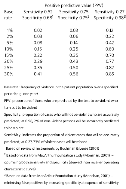 The ‘base rate’ problem is also correctly identified. Maden points out that risk assessment is of little value when the base rate of violence in the population being tested is low (as it is, for example, in general community patients). However, many still fail to appreciate the astonishing effect of base rate on the accuracy of prediction. I illustrate this in Table 1, where the ‘positive predictive value’ of three tests is shown (that is, the proportion of patients the test predicts will be violent who actually turn out to be violent). For example, using the average precision of the 24 predictive studies assessed by Buchanan and Leese (Reference Buchanan and Leese2001), if 5% of the population of interest is violent, the test will be wrong 92 times out of 100. An immense effort went into the MacArthur study, which prospectively examined a host of risk factors for violence following discharge from hospital of over 900 patients (Reference Monahan, Steadman and SilverMonahan et al, 2001), and I believe it is unlikely that better accuracy can be achieved. After all, unlike engineers who must predict the release of toxic waste from an industrial plant, mental health workers are trying to predict an act committed by a person, an agent with intention, who is engaged in ongoing myriad and complex interactions with others. Note that settling for a reduced ‘sensitivity’ means that fewer violent persons will be detected. For a relatively simple way of understanding the mathematics, see Szmukler (Reference Szmukler2001).