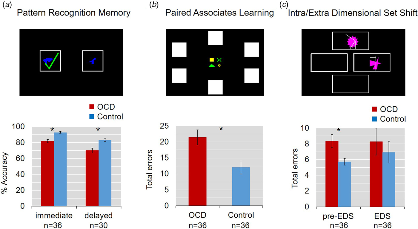 Fig. 2. Impaired learning and memory in adolescent obsessive–compulsive disorder (OCD). Error bars denote s.e.m. (a) Pattern Recognition Memory task. Patients identified significantly fewer patterns correctly both in immediate and 20-min delayed recall. (b) Paired Associates Learning task. Youths with OCD made significantly more errors. (c) Intra-Extra Dimensional Shift Task. Groups did not differ in their errors at the extradimensional shift, but patients made more errors in the stages before the EDS.