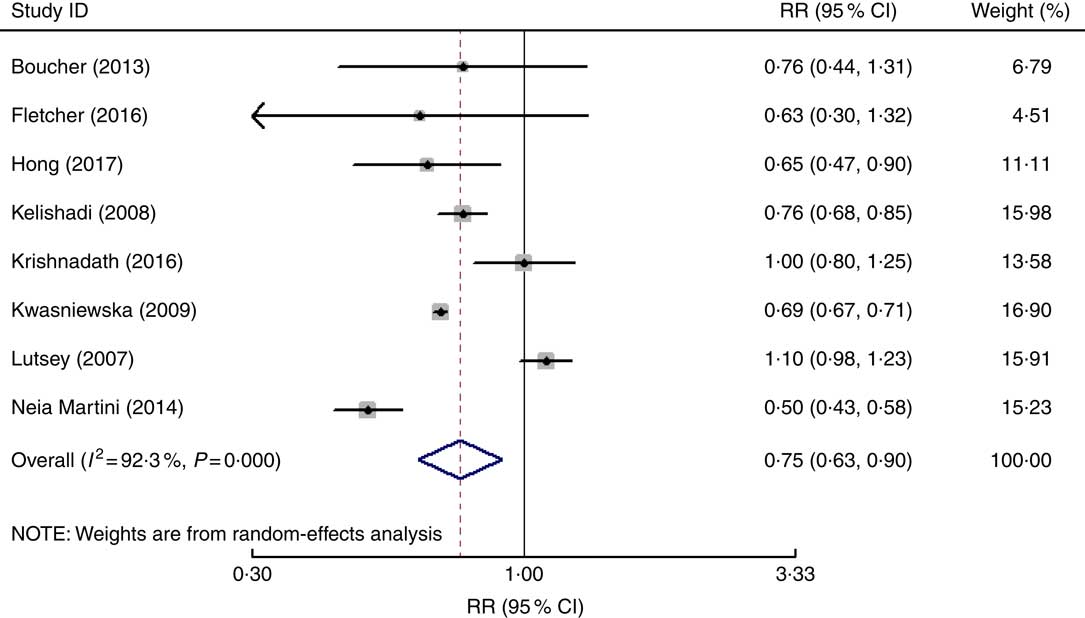 The overall multivariable-adjusted RR showed that vegetable and fruit consumption was negatively associated with MetS (RR=0·75, 95 % CI 0·63, 0·90; P=0·002; Fig. 4). A substantial level of heterogeneity was observed among studies (P<0·001, I 2=92·3 %). No evidence of publication bias was observed among the included studies according to the Begg rank-correlation test (P=0·127). The results of subgroup analysis for vegetable and fruit consumption are shown in Table 4.