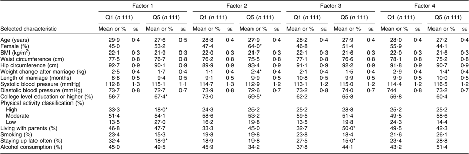 Participants’ characteristics for the dietary patterns are presented in Table 5. The highest quintile of the vegetable pattern had a greater percentage of participants having a college degree or higher (Q5: 67·4 % v. Q1: 56·7 %, P < 0·05) and had fewer subjects staying up late often (Q5: 18·9 % v. Q1: 32·4 %, P < 0·05). The highest quintile of this factor also had more subjects in low physical activity level (Q5: 27·0 % v. Q1: 13·5 %, P < 0·05) and less in high physical activity level (Q5: 18·0 % v. Q1: 33·3 %, P < 0·05). The highest quintile of the sweets and fats pattern had more women than men (Q5: 64·0 % v. Q1: 47·4 %, P < 0·05) and a lower percentage of subjects having a college or higher education level (Q5: 59·5 % v. Q1: 73·0 %, P < 0·05); average body weight change after marriage was significantly higher for those in the highest quintile of this factor (Q5: 2·4 v. Q1: 1·1 kg, P < 0·05). The legume pattern had a greater proportion of participants living with parents after marriage (Q5: 50·0 % v. Q1: 32·7 %, P < 0·05) and a lower percentage staying up late often (Q5: 15·0 % v. Q1: 27·5 %, P < 0·05). The poultry, beef and mutton pattern was associated with less weight change after marriage (Q5: 2·9 v. Q1: 1·4 kg, P < 0·05).