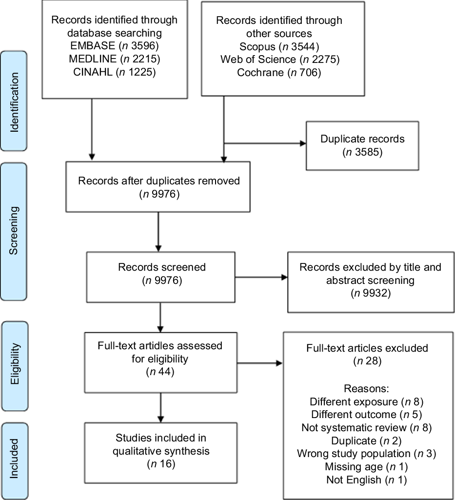 A flow diagram of the study selection process appears below (Fig. 1). Our search strategy identified 9976 records after 3585 duplicates were removed. Of these, 9932 records were excluded after the first screening, leaving 44 full-text articles for the second screening. After further assessment, sixteen articles(Reference Buckland, Bach and Serra-Majem15,Reference Aljadani, Patterson and Sibbritt28Reference Asghari, Mirmiran and Yuzbashian42) met our eligibility criteria for inclusion and narrative synthesis. We summarised the reasons for excluding the twenty-eight full-text articles below (Fig. 1) and in detail in supporting information (Appendix S4). The reasons included not meeting the inclusion criteria such as different exposure, not a systematic review or, missing age. The review of the reference lists added no further eligible articles. The overlapping studies ranged from one to eight in thirteen systematic reviews (Appendix S5)(Reference Buckland, Bach and Serra-Majem15,Reference Aljadani, Patterson and Sibbritt28Reference Garcia-Fernandez, Rico-Cabanas and Rosgaard30,Reference Grosso, Mistretta and Frigiola32,Reference Hsiao, Jensen and Hartman33,Reference Kastorini, Milionis and Goudevenos36Reference Vadiveloo, Dixon and Parekh39,Reference Salehi-Abargouei, Akbari and Bellissimo41Reference Kastorini, Milionis and Esposito43) .