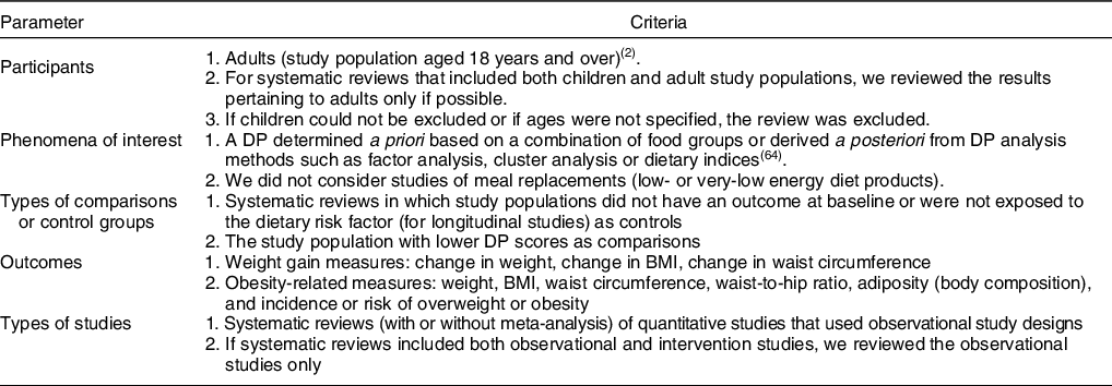 To address the broad aim of this systematic review, we developed our research question and selected our specific inclusion and exclusion criteria using the Population, Interventions, Comparators, Outcomes and Study designs (PICOS) framework (Table 1)(Reference Schardt, Adams and Owens22). Our broad research question is ‘are DP associated with obesity outcomes according to systematic reviews?’ We included systematic reviews (with or without meta-analysis) of observational (cohort, case–control or cross-sectional) studies investigating the association of DP (exposure) on obesity incidence, or weight gain (change in weight, change in BMI and change in waist circumference (WC)), as primary outcomes in adult populations. In this study, a DP can be combination of foods consumed and assessed ‘a priori’ or ‘a posteriori’ (derived from cluster analysis or factor analysis). Unhealthy DP, consisting of foods high in energy such as heavily processed and animal source foods, are associated with excessive energy intake and have undoubtedly played a major role in the development of obesity(Reference Willett, Rockstrom and Loken9). Furthermore, components in food such as refined grains and processed meats as well as an excess of sugary drinks have been classified as detrimental to health(Reference Tapsell23). Moreover, high consumption of saturated fats and low consumption of fruits and vegetables have been described as unhealthy dietary practices(24).