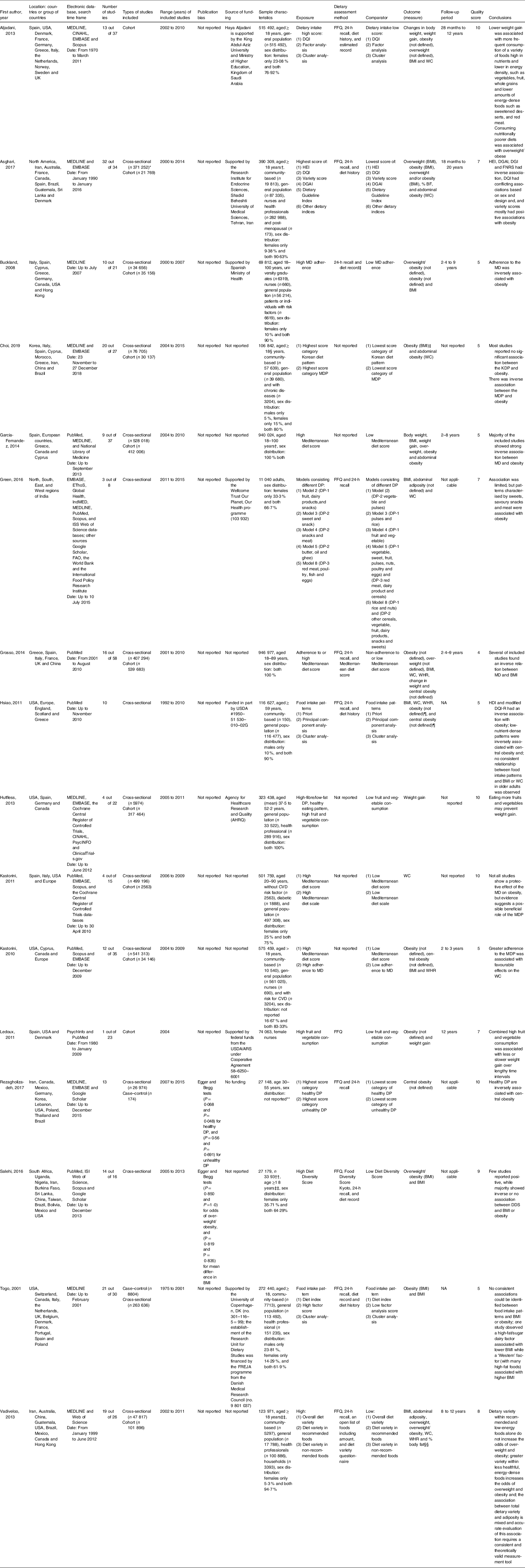 DI, Diet Index; DQI, Diet Quality Index; MDS, Mediterranean diet score; MD, Mediterranean diet; FA, factor analysis; WC, waist circumference; CA, cluster analysis; CHO, carbohydrate; EI, energy intake; HEI, Healthy Eating Index; DDS, Dietary Diversity Score; FVS, food variety score; DGAI, Dietary Guidelines for Americans Index; DGI, Dietary Guideline Index; PNNS-GS, Program National Nutrition Sante´-Guideline Score; ARFS, Australian Recommended Food Score; RFS, Recommended Food Score; EDI, Elderly Dietary Index; DQS, dietary quality score; NRFS, Not Recommended Food Score; MDP, Mediterranean diet pattern; KDP, Korean dietary pattern; RR, relative risk; DP, dietary pattern; HDI, Healthy Diet Indicator; FS-MDS, Framingham-SENECA Mediterranean Diet Score; HDS, Healthy Diet Score; DQI-R, Diet Quality Index, Revised; PCA, principal component analysis; FV, fruit and vegetable; DMGFV, combination of dairy, meat, grain, fruit and vegetables; DDS-R, Dietary Diversity Score-Revised; FVR, Food Variety Ratio.
