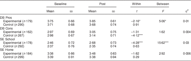 There was no difference between groups for behaviours or other GE constructs at baseline. The experimental group improved GE behaviour score from pre to post more than the control group with a small to medium effect size (see Table 3). There was a significant multivariate time × group effect for other GE constructs: DB (Pros and Cons) and SE (School and Home). For DB Pros and SE School, univariate analyses showed that the experimental group increased scores more than the control group over time with a small to medium effect size but there were no differences in DB Cons and SE Home (see Table 4). Within-group analyses showed the experimental group significantly increased GE behaviours, DB Pros and SE School with no change in the control group; however, DB Cons increased in the control group with no change in the experimental group.