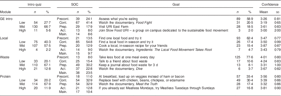Of the 201 experimental participants who accessed the modules, 78·1 % accessed all four modules, 10·2 % accessed three modules, 7·0 % accessed two modules and 4·7 % accessed one module. The majority of participants scored in the median range on intro quizzes, indicating moderate engagement in target behaviours. For the GE intro and local SOC algorithms, two-thirds of participants were not ready to change (i.e. in precontemplation or contemplation SOC). In contrast, 46 % had taken meaningful action to change (i.e. in action or maintenance SOC) for reducing waste. Participants were likely to be in contemplation or preparation SOC (65·8 %) for using environmentally conscious proteins, indicating awareness of the problem. Most common goals selected by participants included ‘make one healthy change to your diet’, ‘try one locally produced food on or off campus’, ‘take less food at one meal every day’ and ‘eat veggies instead of ham or bacon at breakfast’ (see Table 6).