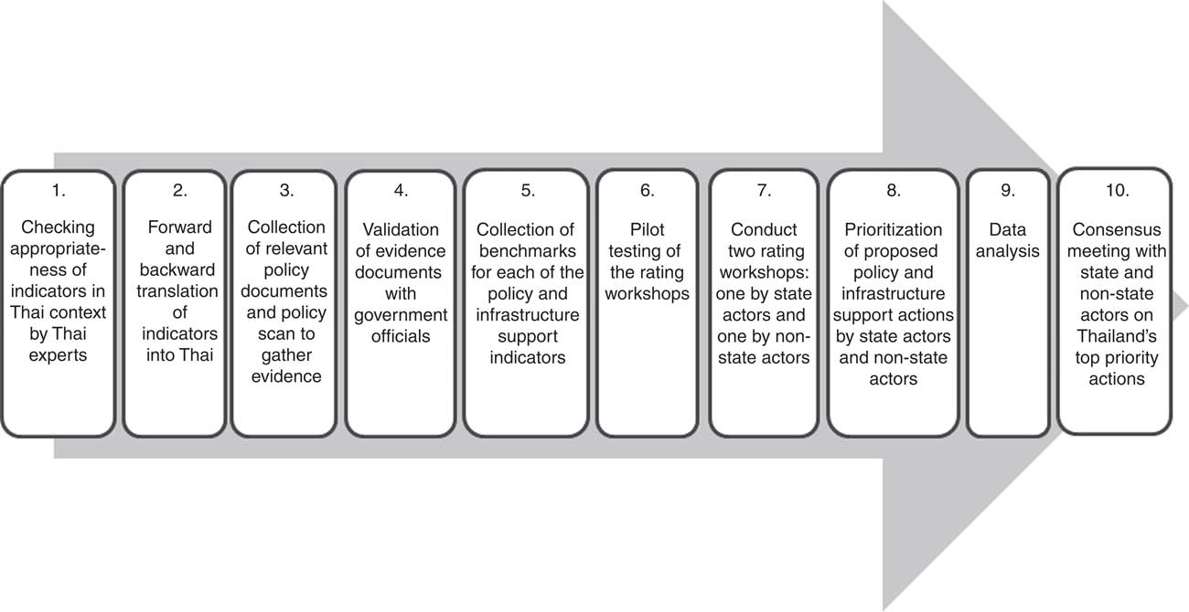 Fig. 1 The ten-step process for assessing the implementation of food environment policies and infrastructure support for policy implementation in Thailand (adapted from Swinburn et al.( Reference Swinburn, Dominick and Vandevijvere 8 ))