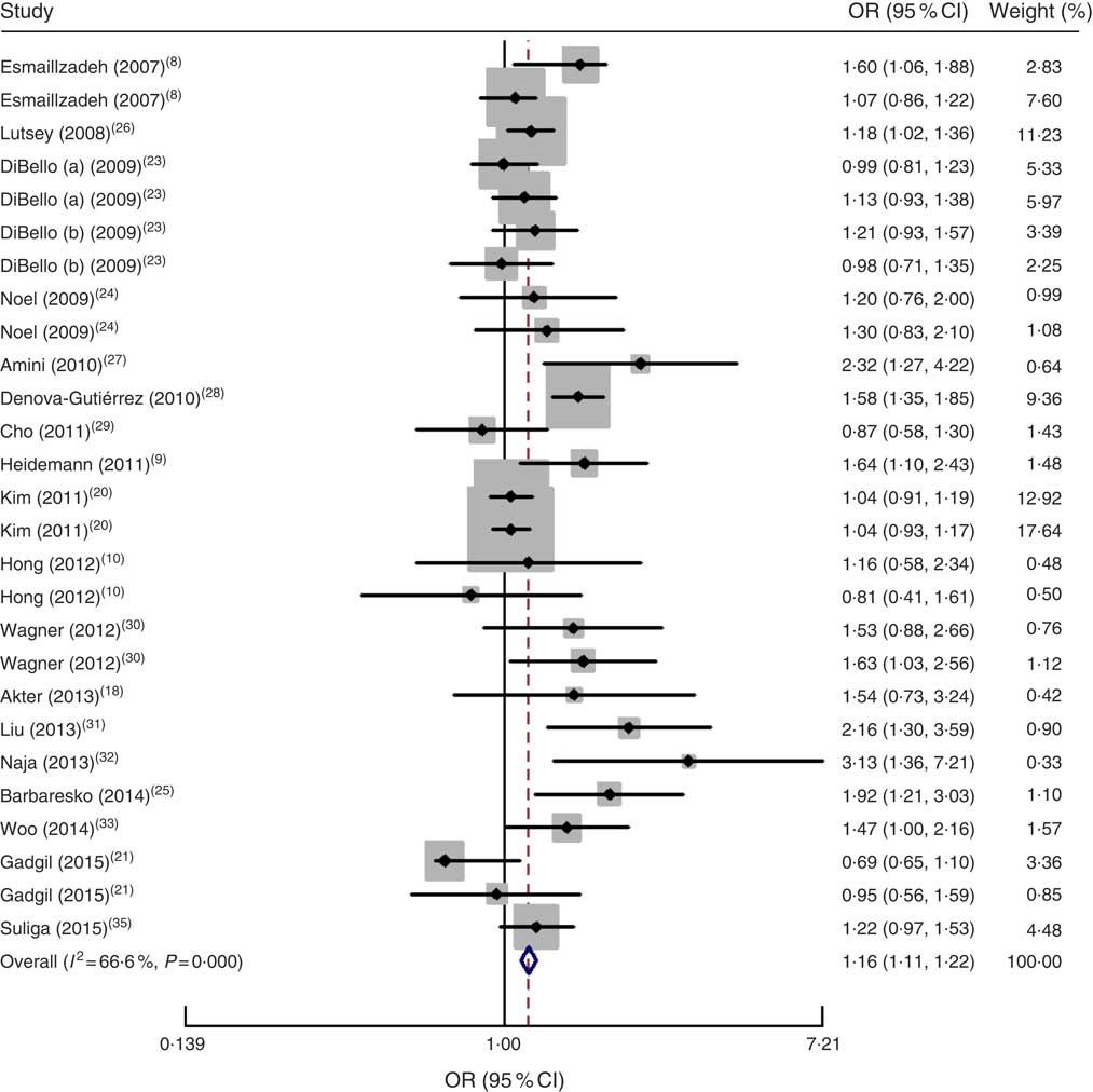 The ‘Unhealthy/Western’ dietary pattern had a significant positive association with risk of MetS (OR=1·16; 95 % CI 1·11, 1·22; P<0·001). There was moderate heterogeneity in studies (I 2=68 %; 95 % CI 50, 78 %; P<0·001; τ 2=0·034), as shown in Fig. 3.