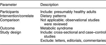 Table 1 Description of the PICOS (population, intervention, comparator, outcome, study design) criteria used to define the research question